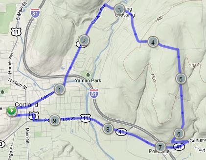 This is one of my standard road runs in Cortland. It gets out of the city fairly quickly and features a couple small hills and pleasant views.